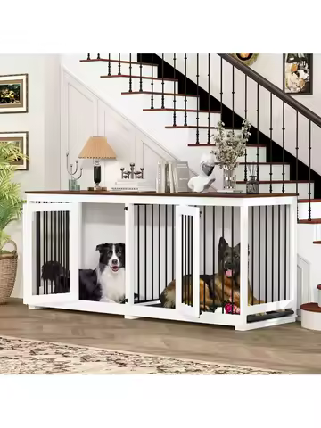 Large Wooden Dog Crate Furniture with Divider and Two Trays for Large or Dual Medium Breeds Indoor, White