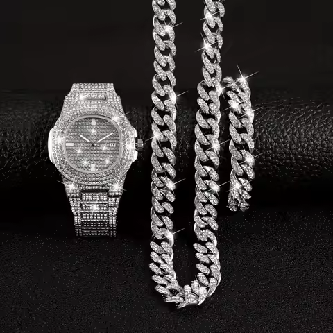 12mm Cuban Chain With Watch Set Gift Box Men's Ice Inlaid Necklace Bracelet Watch Set Hip Hop Chain Ice Jewelry Men's Jewelry