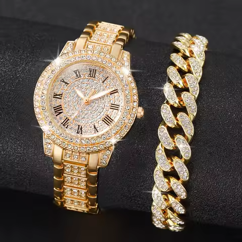 2PCS Fashion Diamond Women Watches Gold Watch Ladies Wrist Watches Luxury Rhinestone Womens Bracelet Watches Relogio Feminino