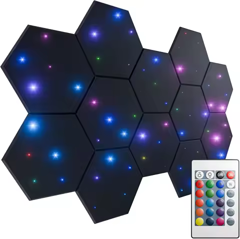 12 Pack Self-adhesive Hexagon Acoustic Foam Panels with Fiber Optic Starlight, Noise Absorbing Wall Decor Black
