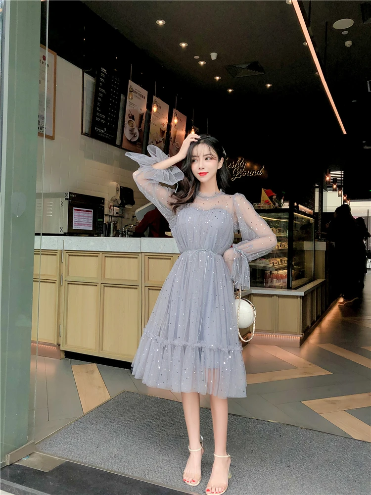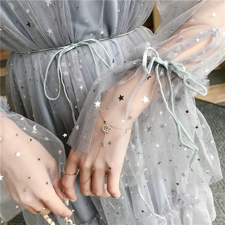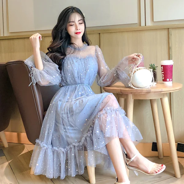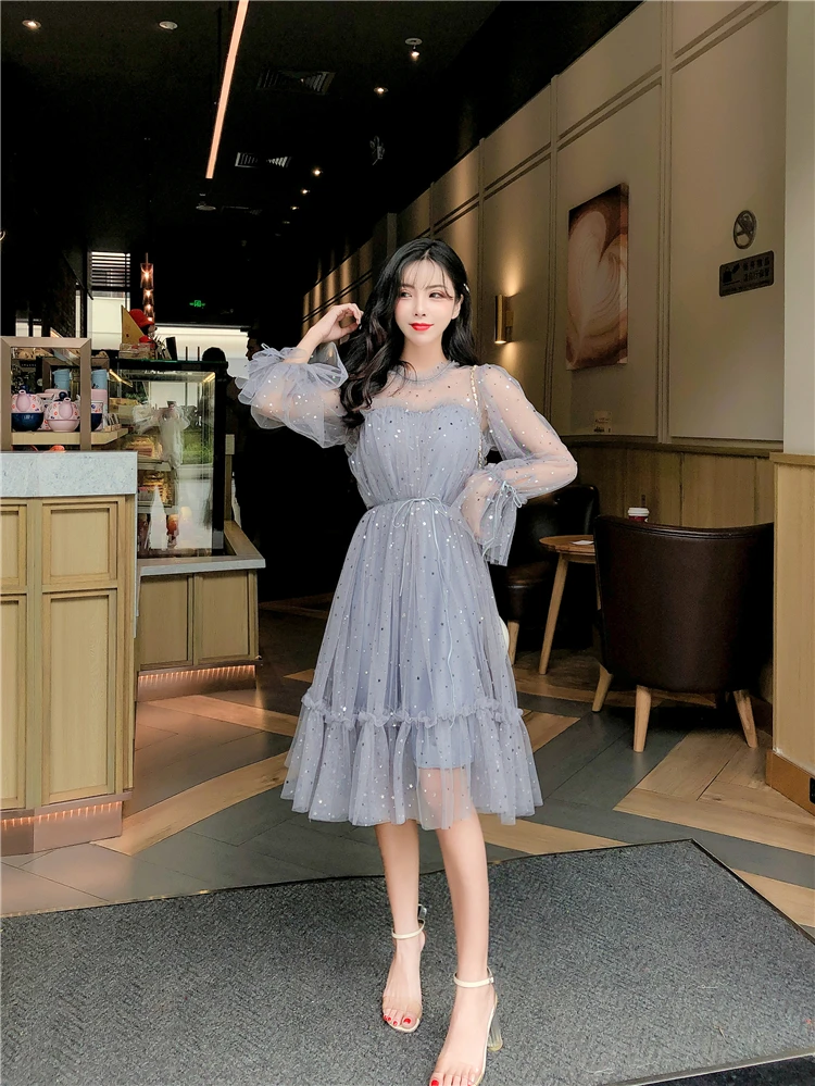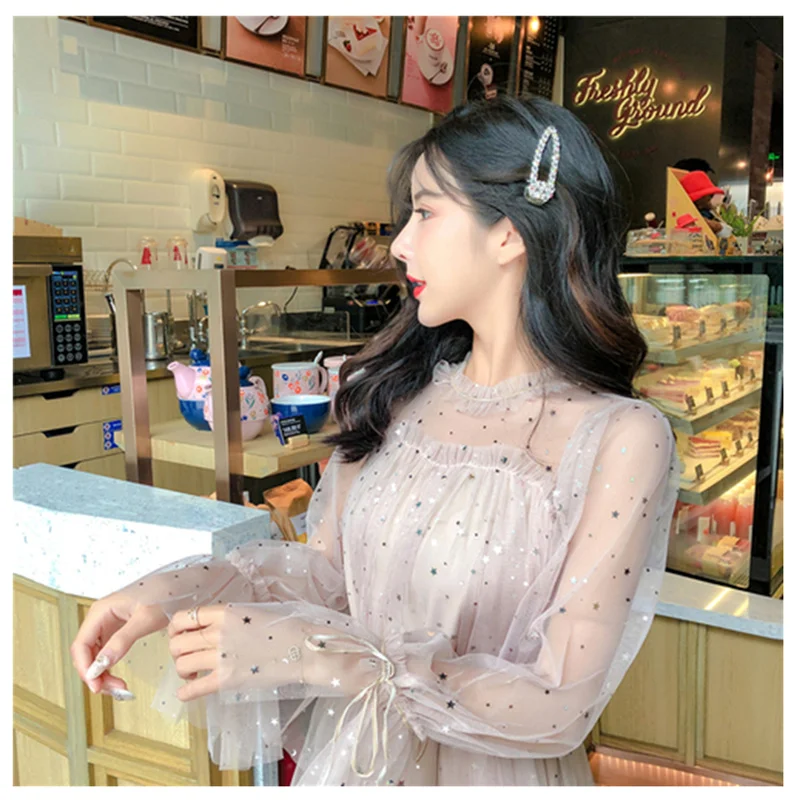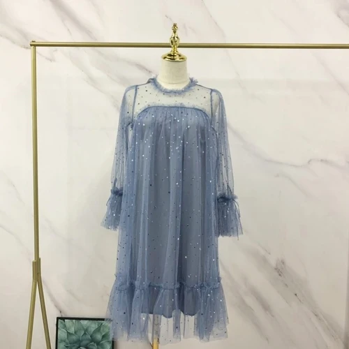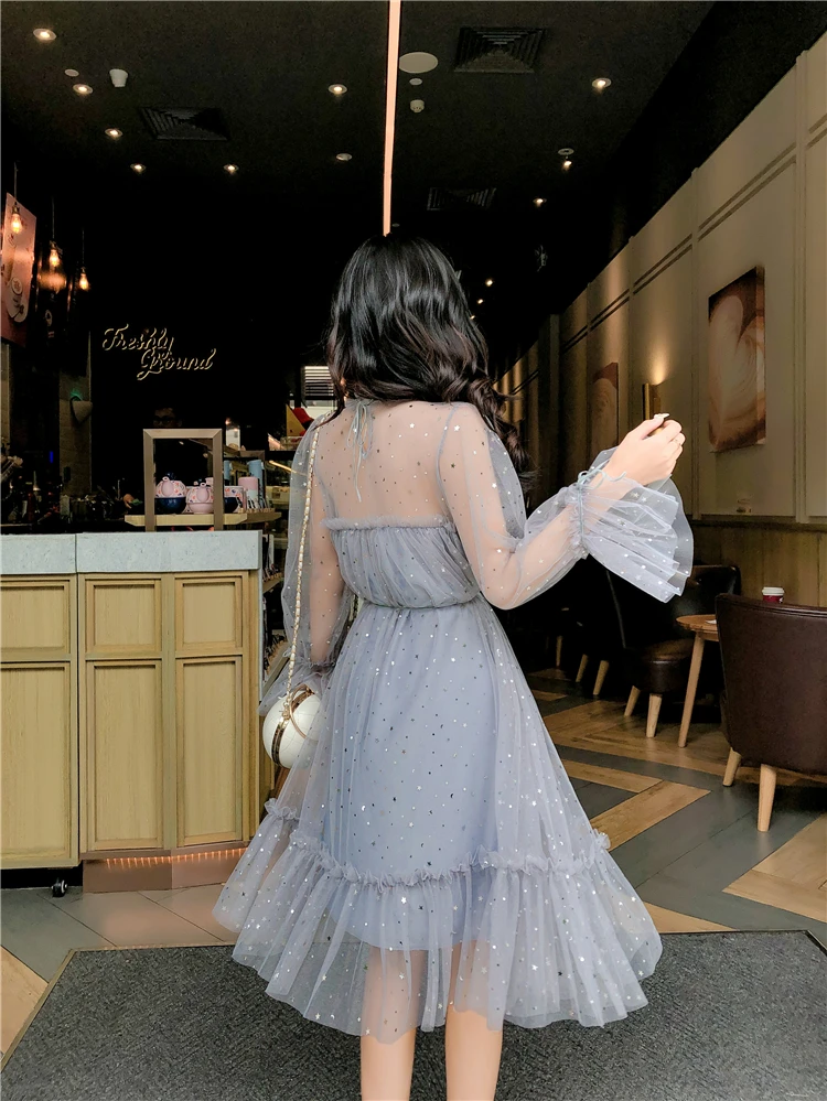 New shiny women dress sequined transparent loose a line mesh patchwork elegant solid summer dress korean style kimono