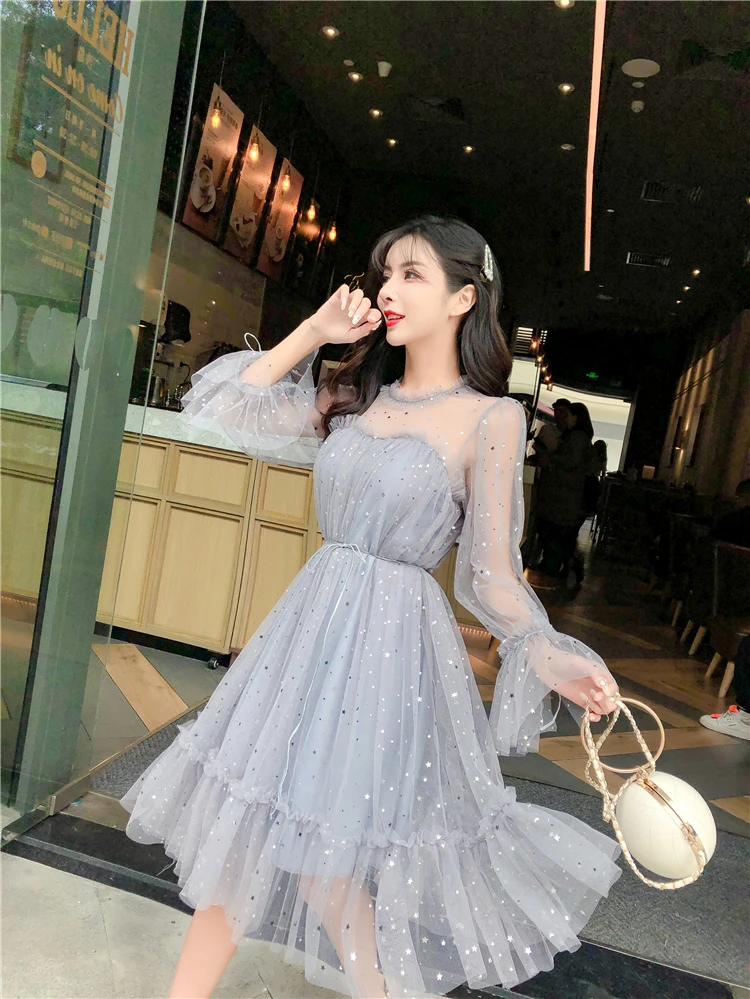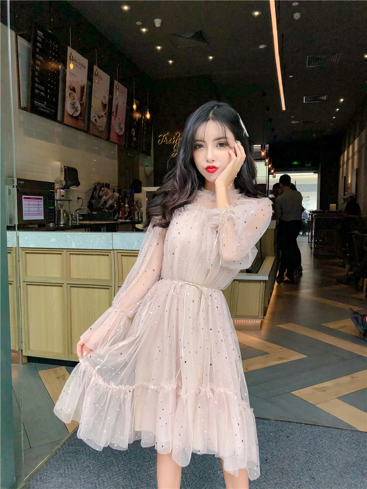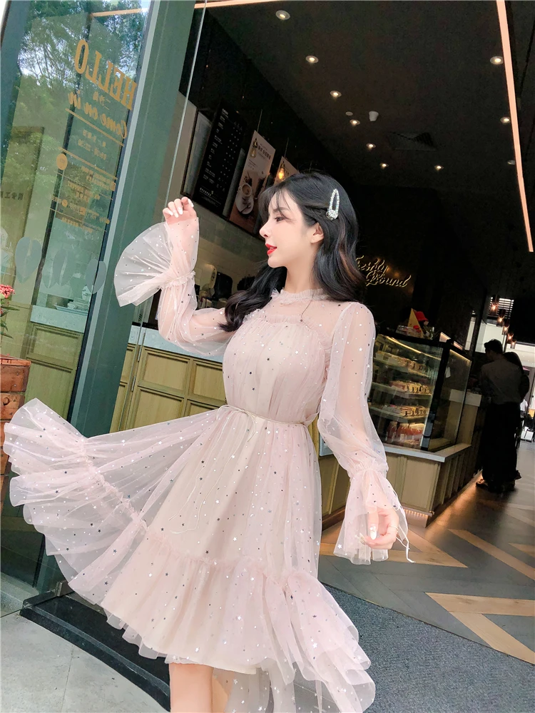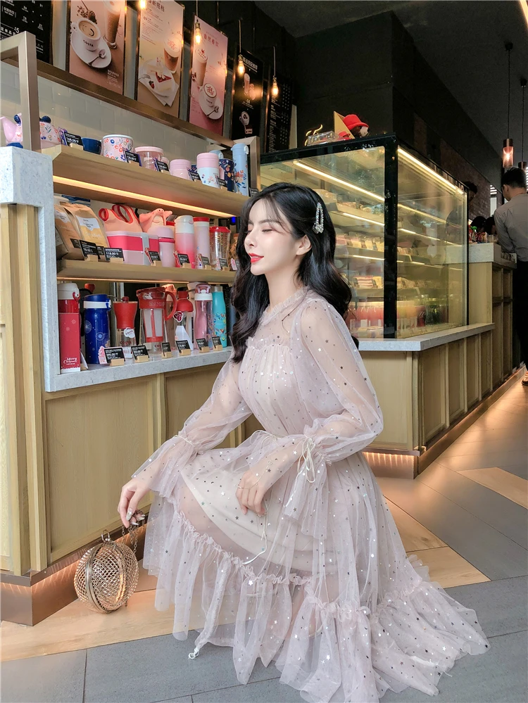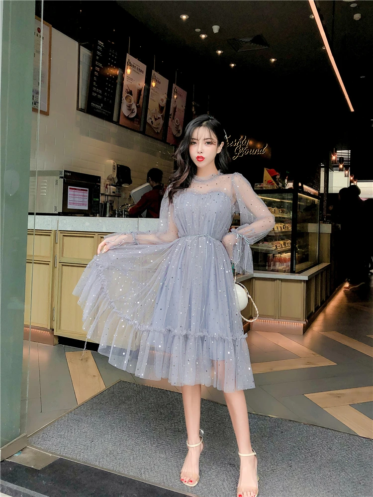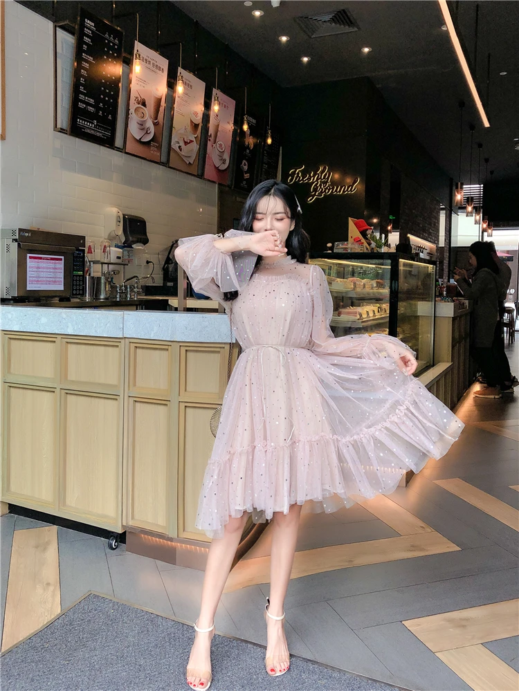 New shiny women dress sequined transparent loose a line mesh patchwork elegant solid summer dress korean style kimono