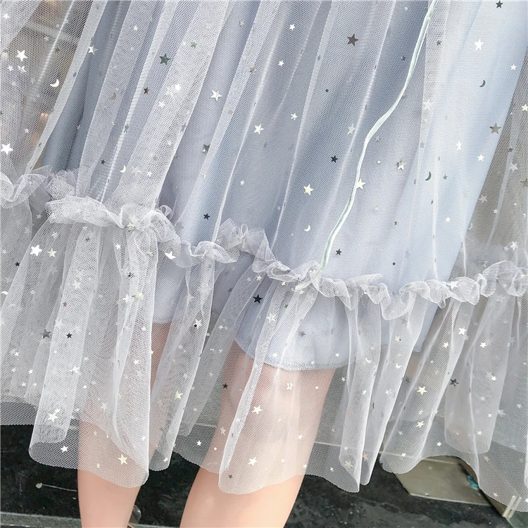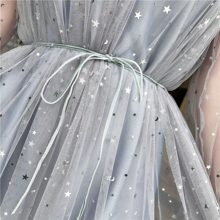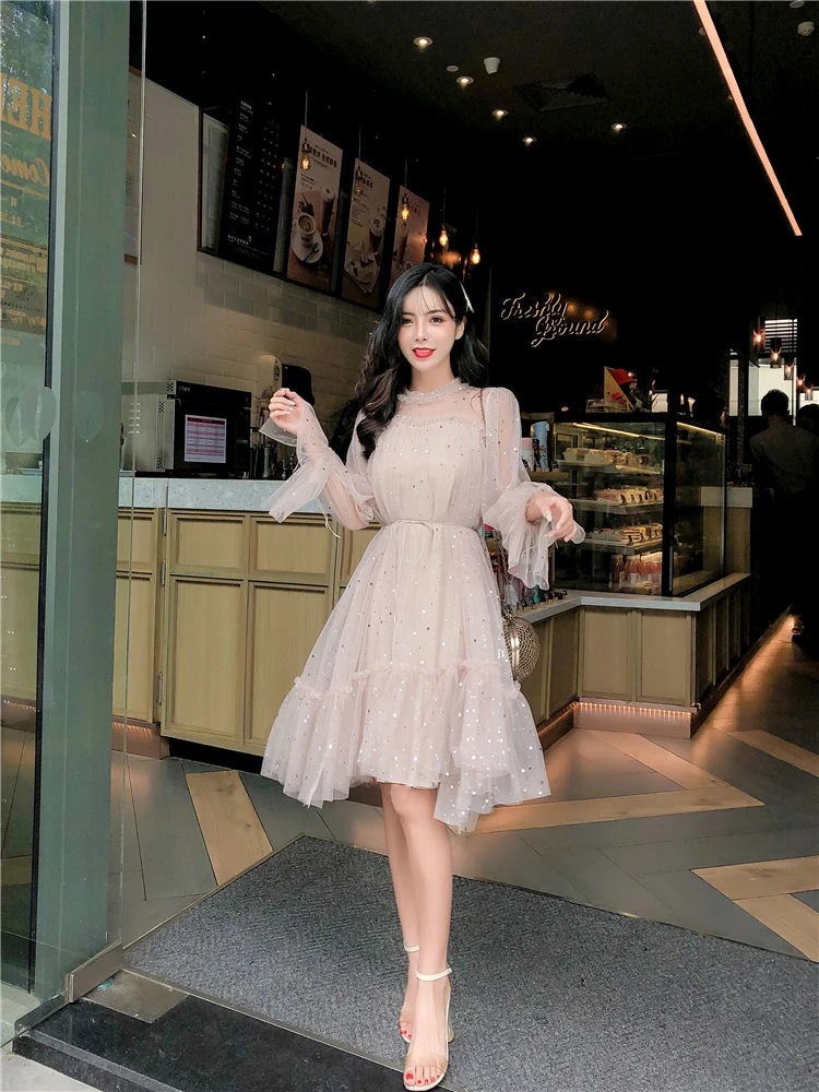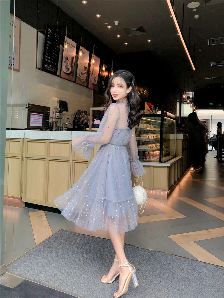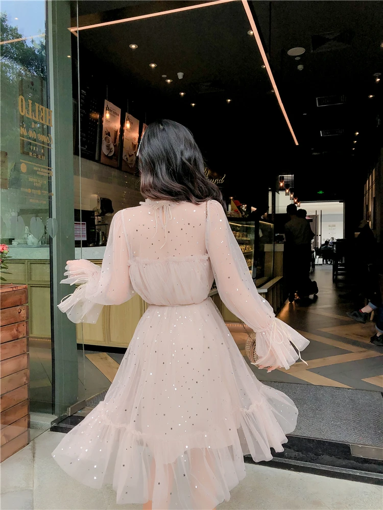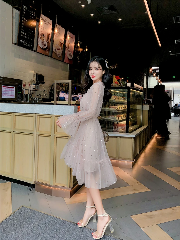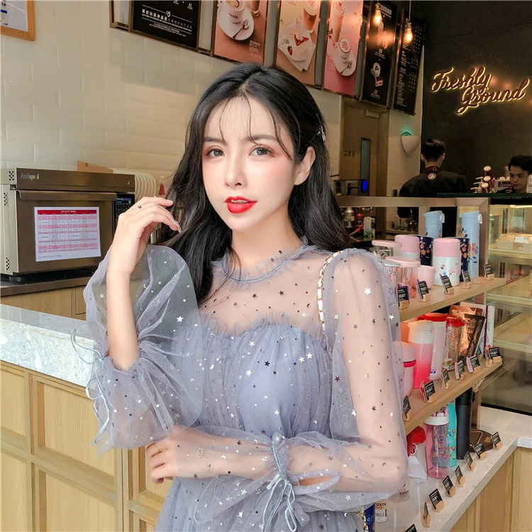 New shiny women dress sequined transparent loose a line mesh patchwork elegant solid summer dress korean style kimono