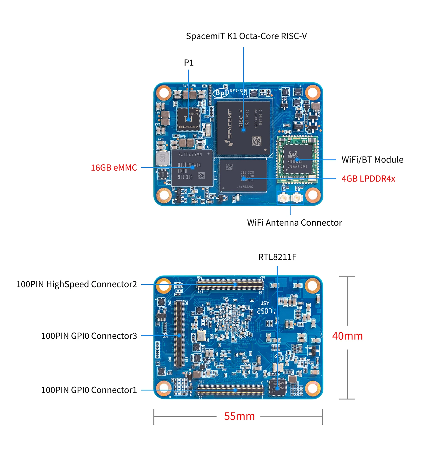 Banana Pi BPI-CM6 SpacemiT K1Octa-core 64-bit RISC-V AI 4GB LPDDR4 16GB eMMC Integrates RTL8211F PHY Industrial control Board