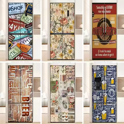 Retro Graffiti Poster Fridge Door Sticker Decals Waterproof PVC Tiling Floral Pattern Refrigerator Door Wrap Cover Kitchen Decor