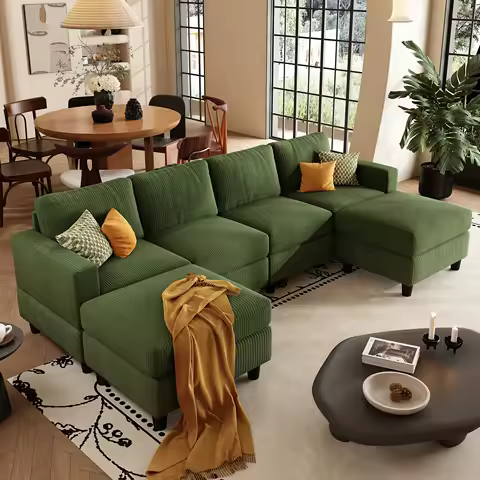 101 Inch Green Corduroy Sectional Sofa, U Shaped Sectional Sofa with 2Ottomans, 6 Seater Convertible Corduroy Sofa, Comfortable