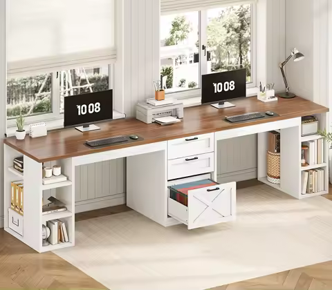 Farmhouse 96.5" Computer Desk with Drawers, 2 Person Home Office Desk, Gaming Double Desk with Storage Shelves,, Customized