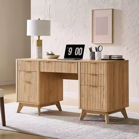 Fluted Executive Desk with Drawers, 60" Modern Home Office Computer Desk with Charging Station, File Cabinet,, Customized