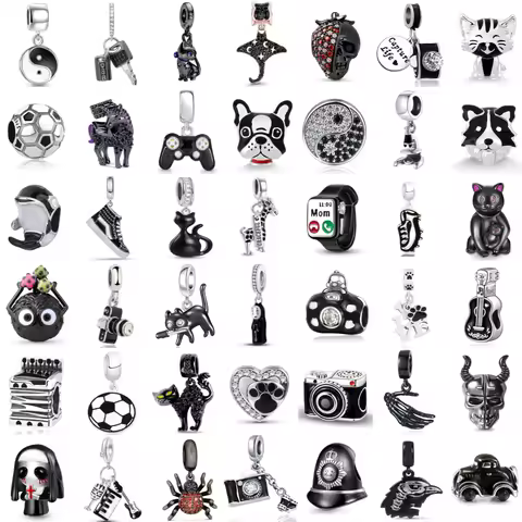 新しい925シルバー製ブラックカラーチャーム、サッカー、猫、太極拳、カメラ、オウム、ギターのペンダント、ビーズ、オリジナルブレスレットに適合、ジュエリーギフト