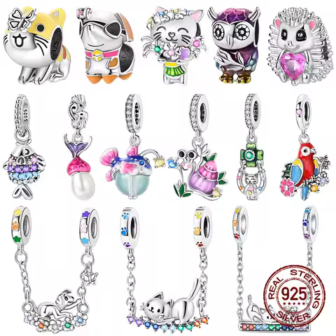 かわいい動物のチャームビーズ、925スターリングシルバー、4mmの穴の直径のブレスレット、DIYジュエリー、猫、犬、カタツムリ、ハリネズミ、オウム、フクロウに適合