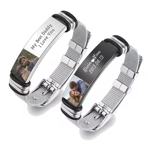 사용자 정의 사진 텍스트 팔찌 맞춤형 스테인레스 스틸 새겨진 그림 이름 팔찌 여성을위한 맞춤 선물 남자 친구 아빠
