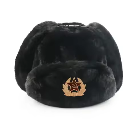 ロシアのウシャンカ帽(男女兼用)- ヴィンテージソビエトスタイルの冬用帽子、バッジ付き、フェイクラビットファーの耳当て付きボンバーハット
