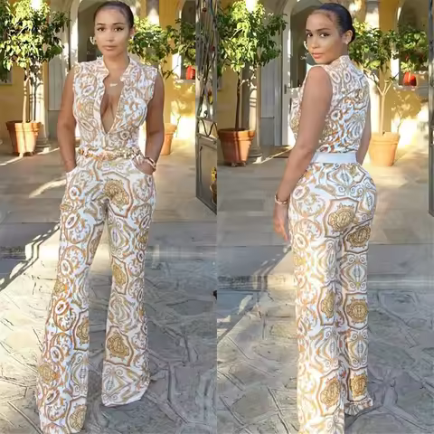 Women's Casual Loose Overalls Jumpsuits One Piece Sleeveless Printed Wide Leg Long Pant Rompers